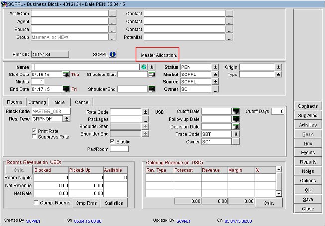 Note: Master Allocations do not allow for Reservations to be picked-up against them. Due to the unique logic with Master Allocations, regardless of the Booking Status, the Room Grid will start as a Current Grid; no Original Grid will be recorded. Also, because room night and room revenue production are adjusted off a Master Allocation when rooms are allocated to a Sub-Allocation, the 'Blocked' Numbers on the Master Allocation Booking screen will always display the number of AVAILABLE rooms.