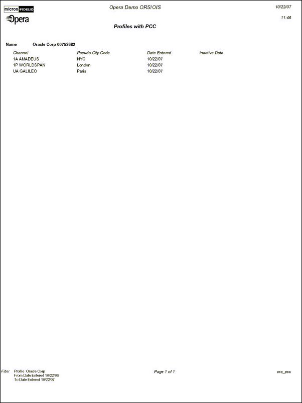 This report displays the company or travel agent profile name and its channels and properties. Each channel and property having pseudo city codes (PCC) appear. You can also filter for Inactive From/To PCC dates.