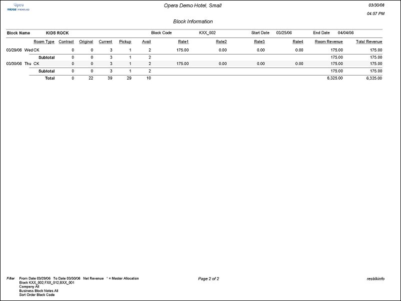 Blocks. Multi Select LOV to select specific blocks to filter by and display in the results of the report. When the application function Blocks > Master Sub Allocations is active, the Master and Sub-Allocations will be indicated in the Block Header Information. Additionally, the Current column will display the available inventory for the Master Allocation and Pickup column will always display 0 rooms.